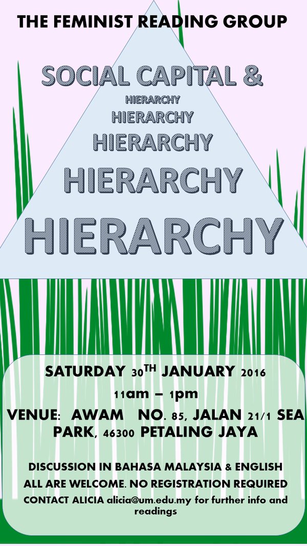 Feminist Reading Group will meet on Saturday morning, 30th January 2016 at 11am, in AWAM (No. 85, Jalan 21/1, Taman SEA, Petaling Jaya). Our topic of discussion is on ‘Social Capital and Hierarchy’ within feminism and inequalities between women.